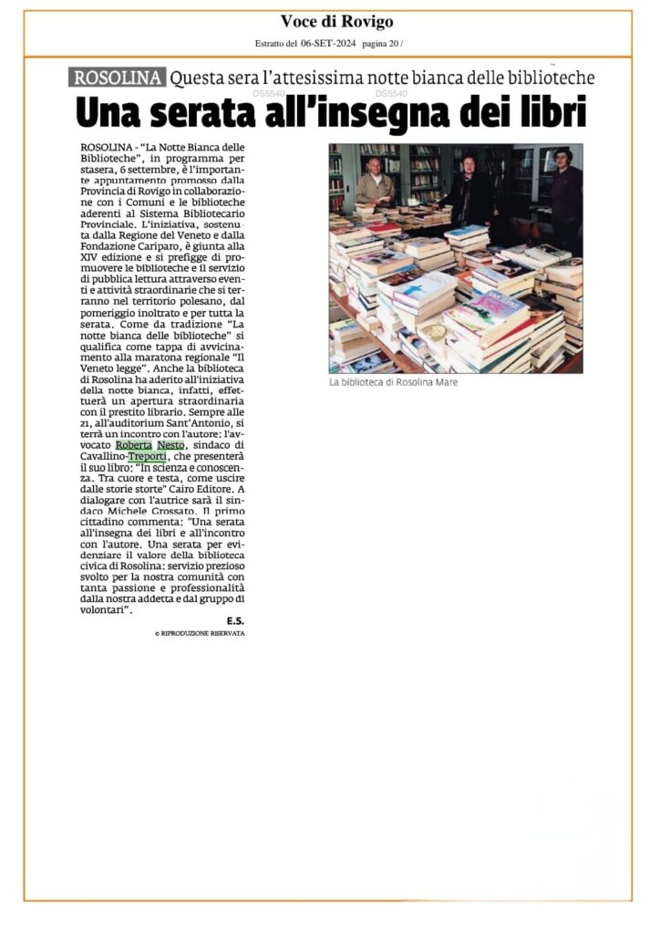 Provincia di Rovigo in collaborazione con i Comuni e le biblioteche aderenti al Sistema Bibliotecario Provinciale. L’iniziativa, sostenuta dalla Regione del Veneto e dalla Fondazione Cariparo, è giunta alla XIV edizione e si prefigge di promuovere le biblioteche e il servizio di pubblica lettura attraverso eventi e attività straordinarie che si terranno nel territorio polesano, dal pomeriggio inoltrato e per tutta la serata. Come da tradizione “La notte bianca delle biblioteche” si qualifica come tappa di avvicinamento alla maratona regionale “Il Veneto legge. Anche la biblioteca di Rosolina ha aderito all’iniziativa della notte bianca, infatti, effettuerà un apertura straordinaria con il prestito librario. Sempre alle 21, all’auditorium Sant’Antonio, si terrà un incontro con l’autore: l’avvocato Roberta Nesto, sindaco di Cavallino-Treporti, che presenterà il suo libro: “In scienza e conoscenza. Tra cuore e testa, come uscire dalle storie storte” Cairo Editore, A dialogare con l’autrice sarà il sindaco Michele Grossato. Il primo cittadino commenta: “Una serata all’insegna dei libri e all’incontro con l’autore. Una serata per evidenziare il valore della biblioteca civica di Rosolina: servizio prezioso svolto per la nostra comunità con tanta passione e professionalità dalla nostra addetta e dal gruppo di volontari”.